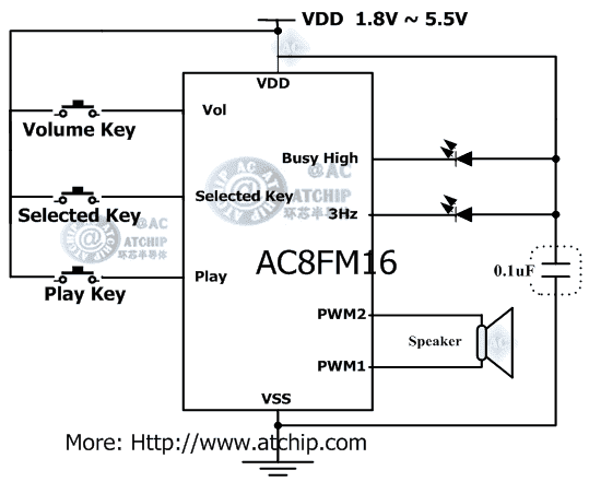 AC8FM16 4和弦音乐门铃IC芯片接线图PWM直推喇叭