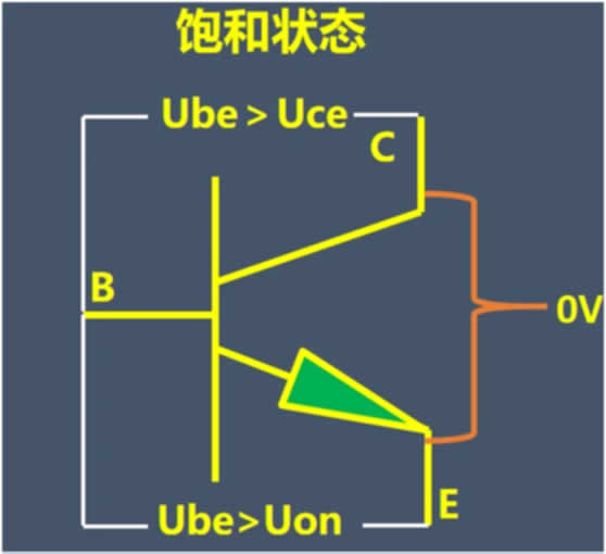 三极管当作开关时其工作在饱和状态,BE间的电压要大于开启电压,同时BE间的电压大于CE间的电压,CE间的电压可以近似的看成是0。