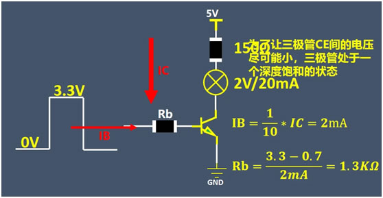 为了让三极管CE间的电压尽可能小,三极管处于一个深度饱和的状态,一般三极管基极的电流取集电极电流的十分之一,这里也就是2mA,三极管导通电压取0.7V,所以有Rb为1.3K欧姆。