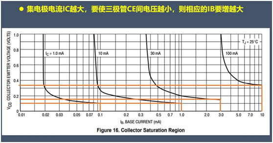 如果三级管集电极电流比较大,这里IB的取值可能要大于IC的十分之一,才能使ce间的电压尽可能小。