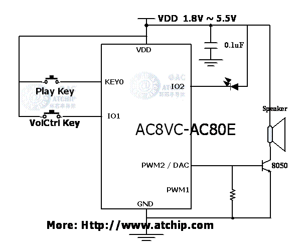 常规标准品叮咚声DAC版芯片资料SOP8贴片八脚/ac8vc12原理图下载 更多资料请参考AC8VC 产品资料